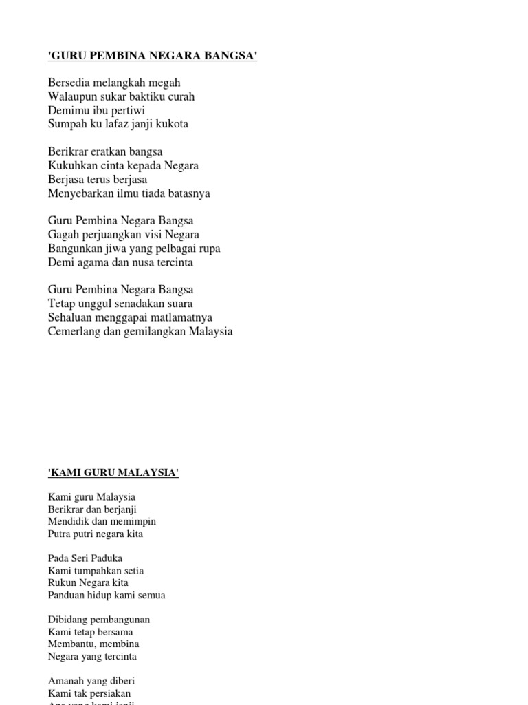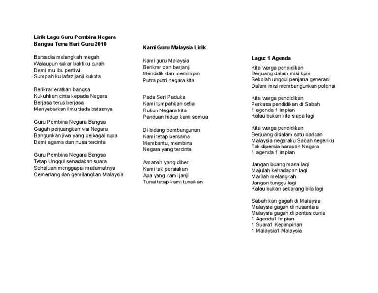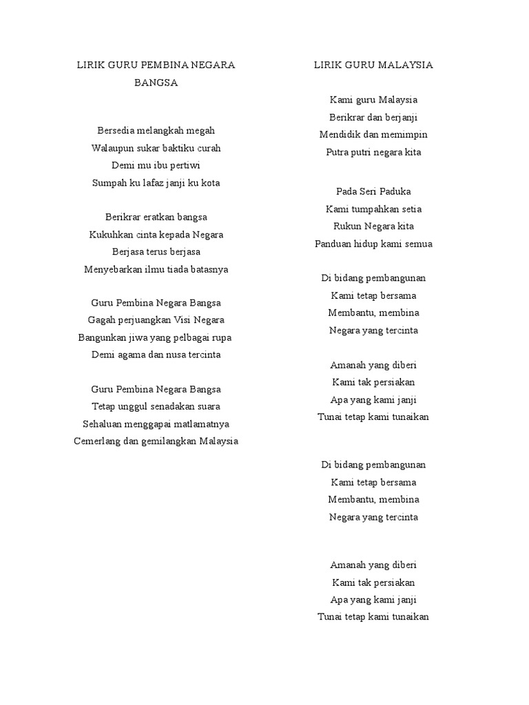 Guru pembina negara bangsa.bersama kita hayati dan selami pengorbanan guru. Guru yang berpekerti mulia, berpandangan progresif dan saintifik, bersedia menjunjung aspirasi negara serta menyanjung warisan kebudayaan negara, menjamin pembangunan individu dan memelihara suatu masyarakat. Posted by alumni smv temerloh at 7:16 am. Nota sejarah ppismp semester 3/2010 di ipg kdri. Lirik lagu kami guru malaysia (hd). Huhu dan xlupa jugak kepada semua cikgu2 di s.k bendang siam, s.k sungai tinggi, smk dato' wan ahmad rasdi dan smk dr. Jasa baik dan pengorbanan kalian hanya allah saja yang mampu membalasnya. Niccolaz on guru pembina negara bangs… Berikrar eratkan bangsa kukuhkan cinta kepada negara berjasa terus berjasa menyebarkan ilmu tiada batasnya. Guru%20 dan%20alam%20pendidikan by gandhikalai gandhi 714 views. Chords for guru pembina negara bangsa. Klip video untuk lagu tema hari guru (dengan lirik lagu) hasil dari gambar aktiviti smkdd1 tahun 2009. Lagu tema hari guru :