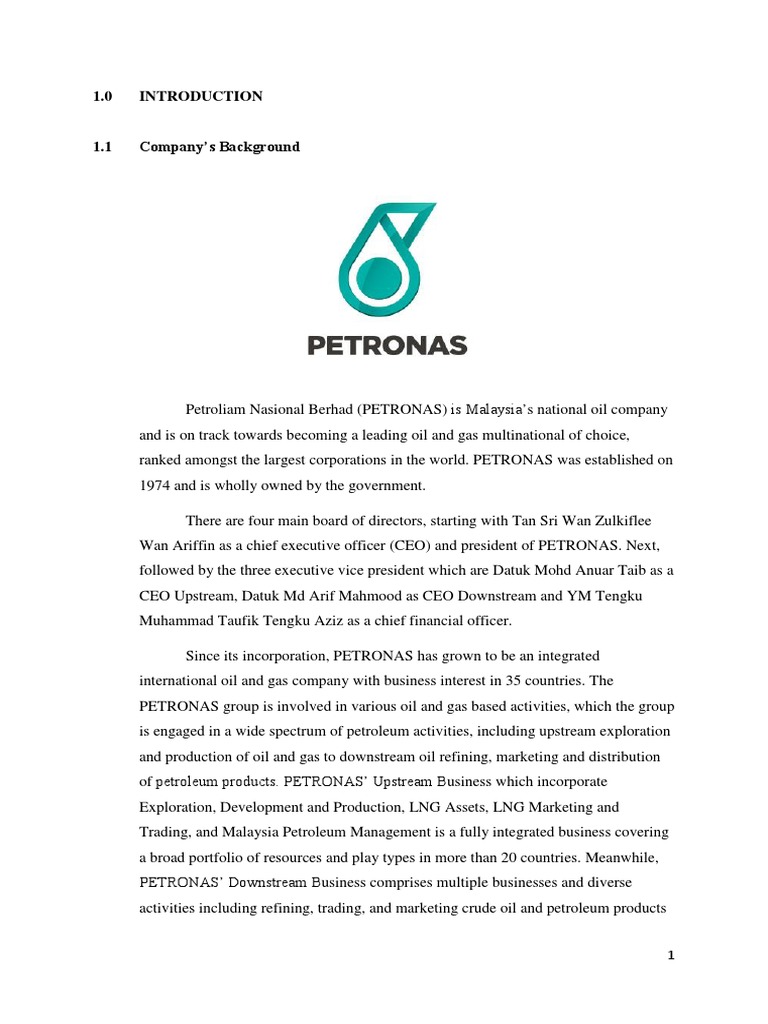 Petroliam Nasional Berhad (Petronas) : Petronas was incorporated on 17 august 1974 as the national oil company of malaysia, vested with the entire ownership and control of the petroleum resources in the country.