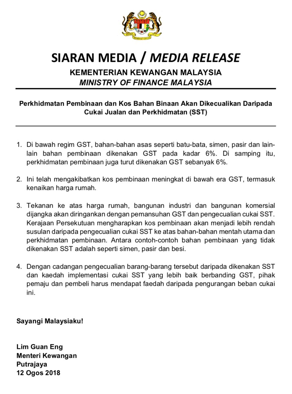 Tiada sst dikenakan ke atas bahan asas binaan dan juga perkhidmatan pembinaan.